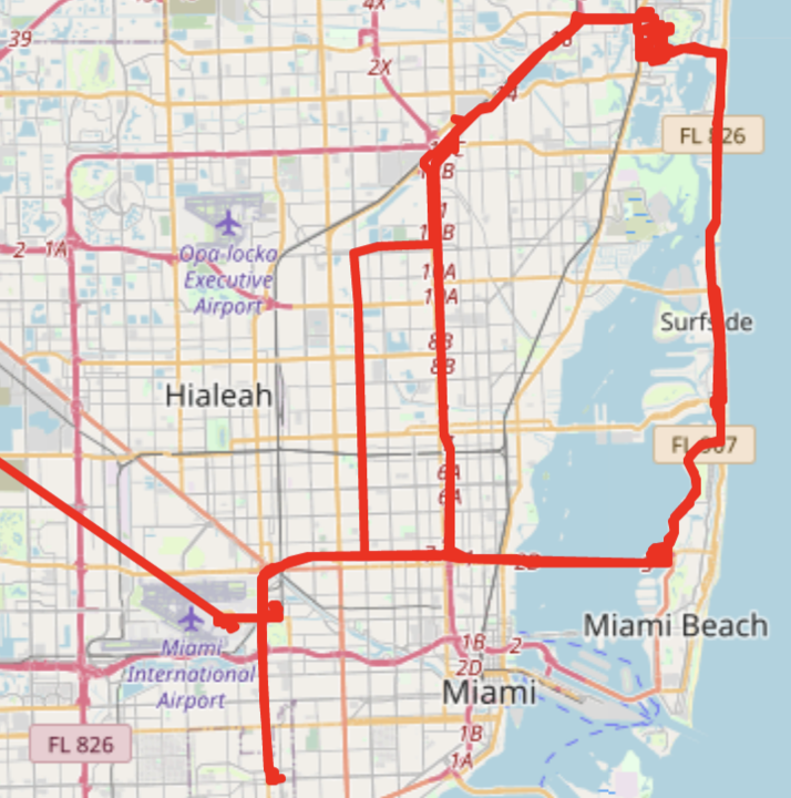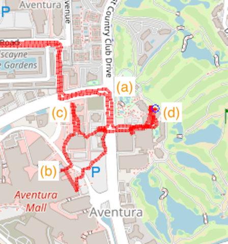 Walking between my hotel and the Aventura mall (left); Zoomed out shows my movement over many days (right)